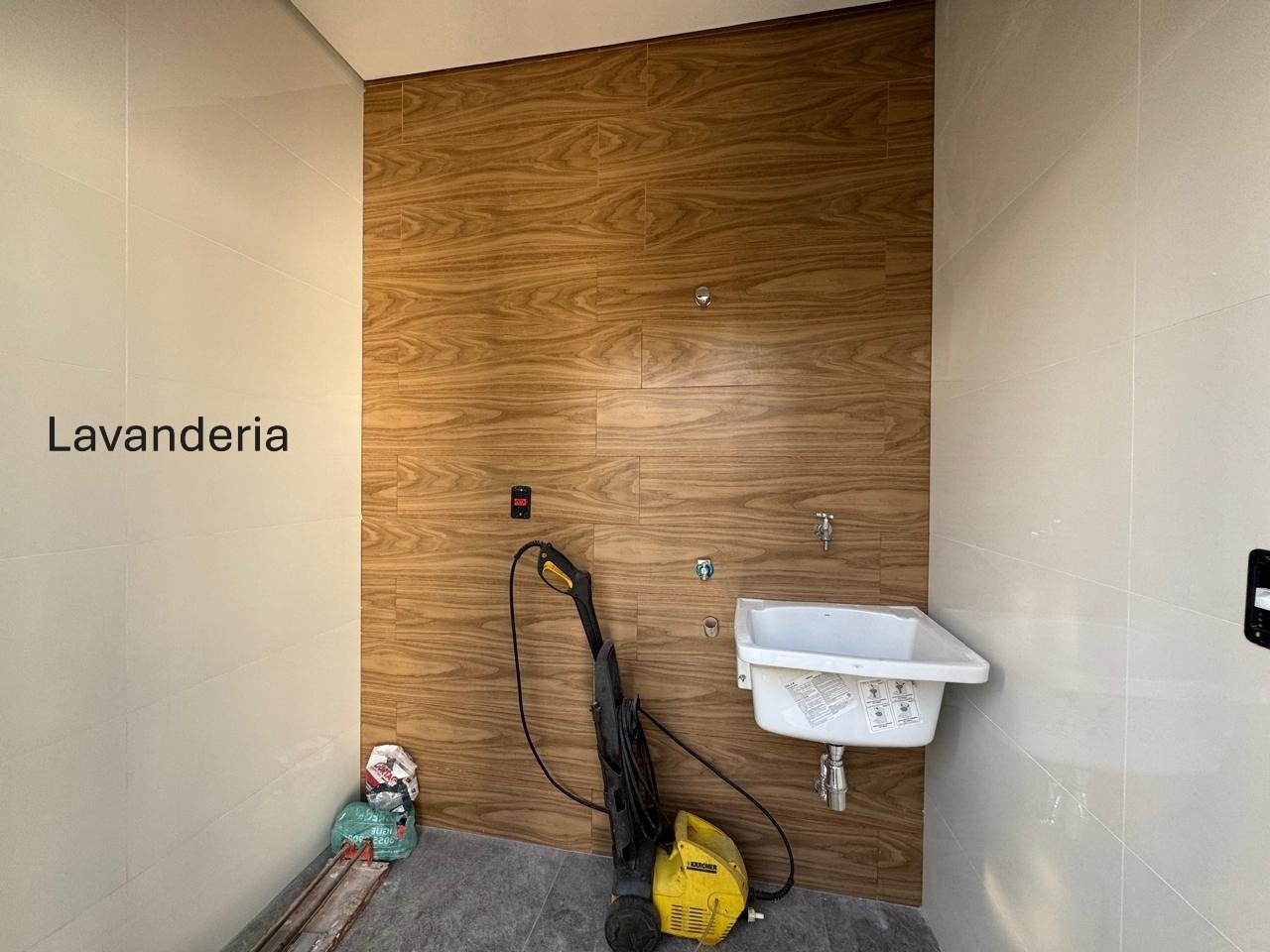 Ampla sala com pé-direito duplo equipada com fechadura eletrônica para maior segurança.